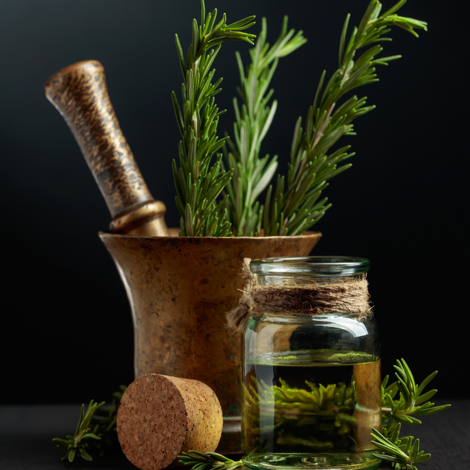 🌿 إكليل الجبل (رُزماري): ينشّط الدورة الدموية ويحفّز البُصيلات.